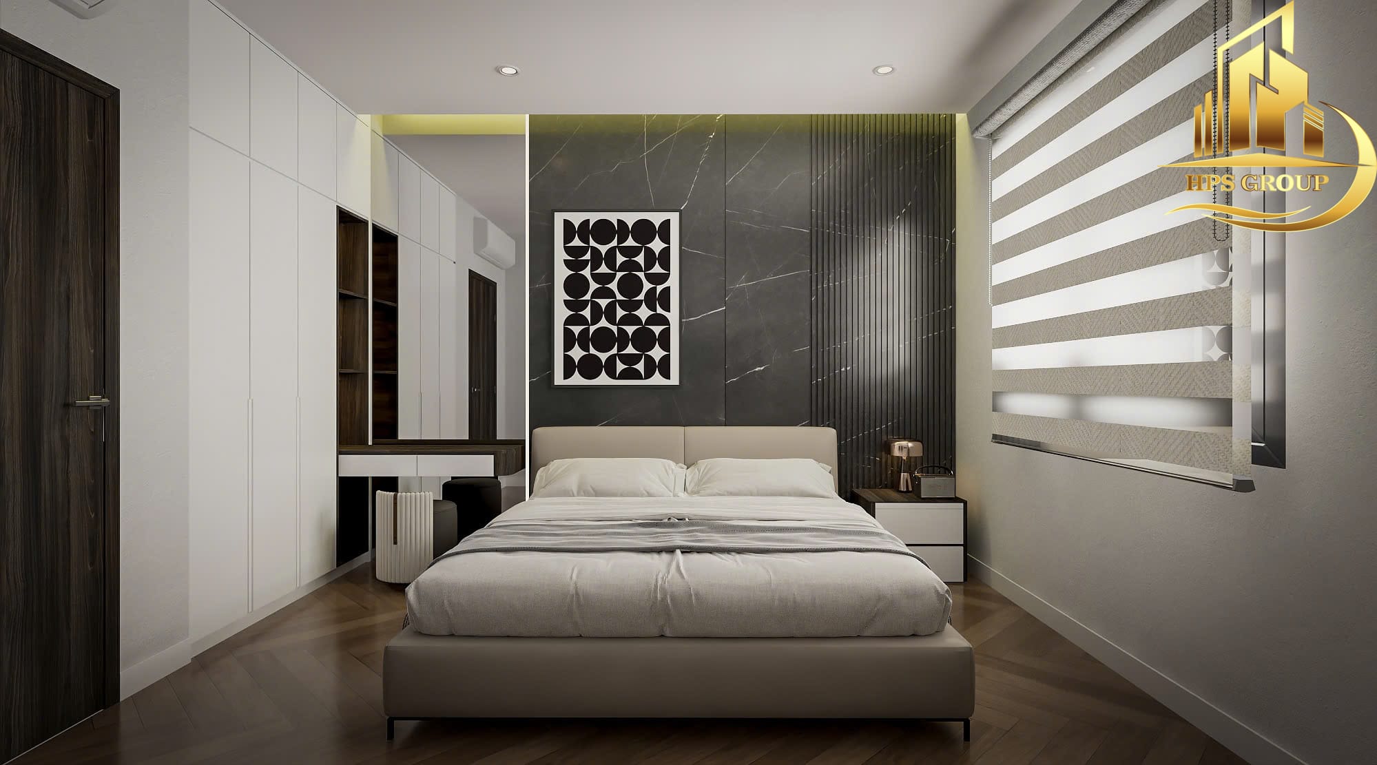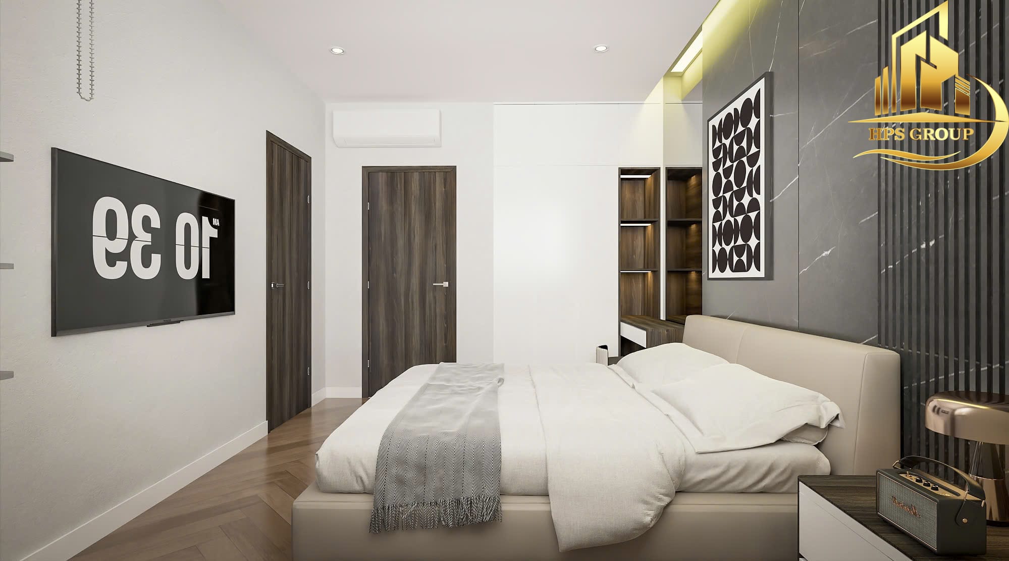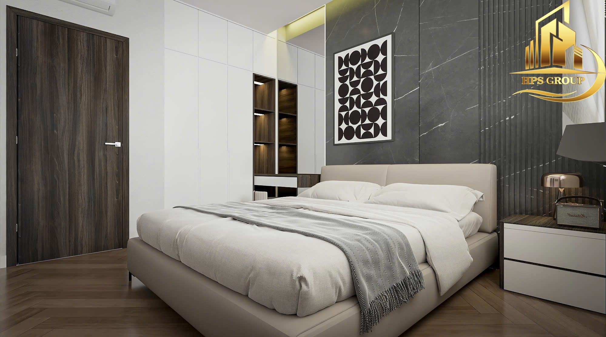 • Phòng ngủ: Thiết kế hướng đến sự thoải mái, thư giãn với nội thất gỗ ấm áp, tủ âm tường tối ưu diện tích.